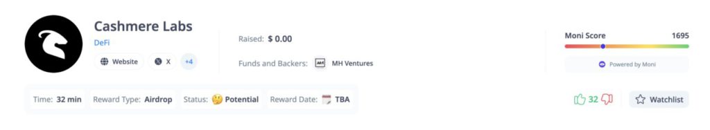 The image above displays information on a crypto project called Cashmere Labs, which is engaged in the DeFi (Decentralized Finance) sector. The project is listed as an airdrop with an estimated participation time of about 32 minutes, and currently has a status of āPotentialā, meaning that the reward or result of this airdrop is still prospective.