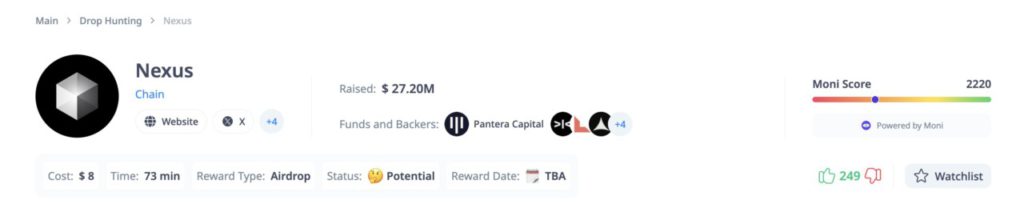 Nexus has raised $27.20 million in investment funds, and is backed by well-known investors such as Pantera Capital and others. The project received a Moni Score of 2,220, which indicates a high position in the projectās confidence and potential indicators, being in the green zone.