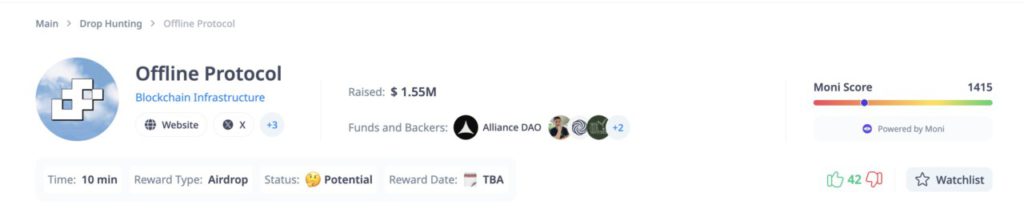 The image above shows the details of a crypto project called Offline Protocol, which is engaged in the Blockchain Infrastructure sector. The project is holding an airdrop program with a very short participation time of only about 10 minutes, making it one of the fastest airdrops to participate in. Its current status is still āPotentialā, meaning that rewards are not yet confirmed to be given, and the distribution date is also still not announced (TBA).