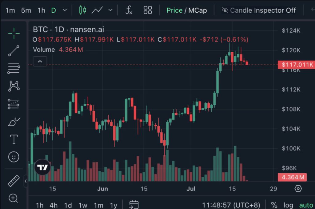 Three days later, on Monday, Bitcoin hit a record high of $123,100 on the Binance platform, before falling back to $117,011 at the time of writing, according to data from Nansen.
