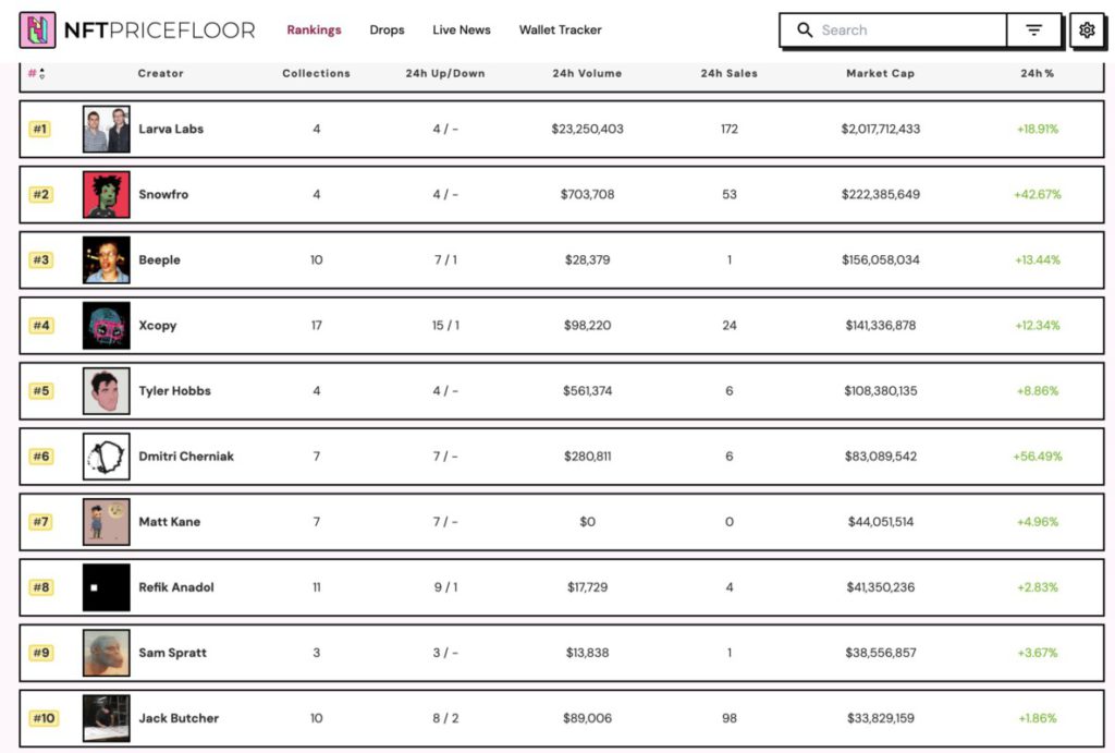 Based on data from NFTPriceFloor, the Top 10 NFT Artist list this time is filled with big names such as Larva Labs, Snowfro, and Beeple who still maintain their influence.