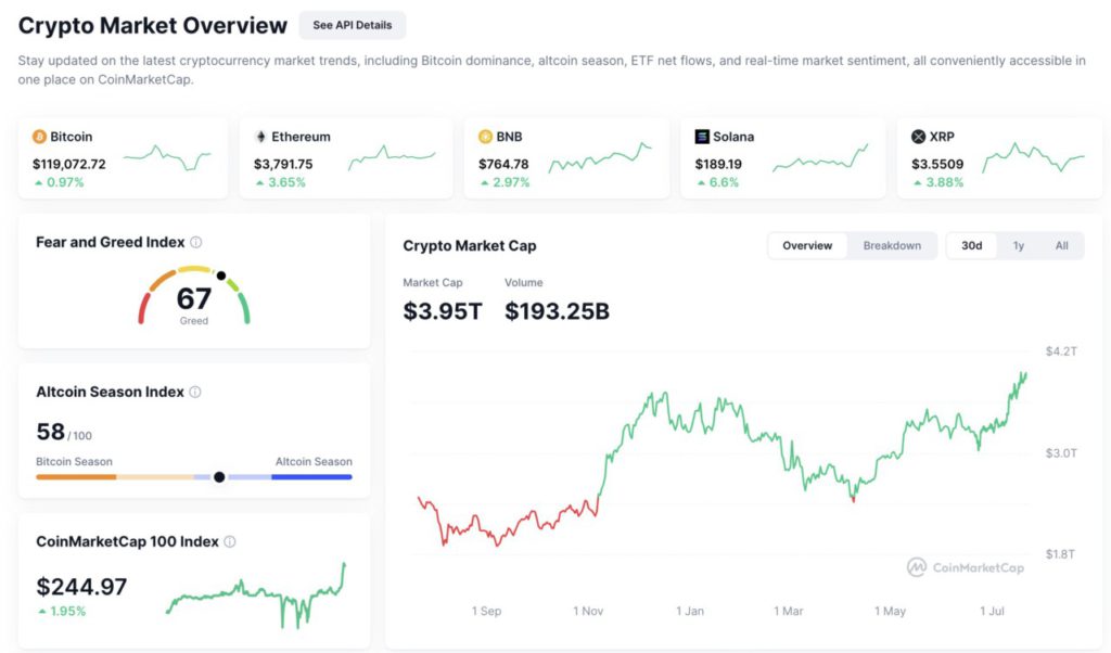 The image above shows the total crypto market capitalization currently stands at $3.95 trillion, with a daily trading volume of $193.25 billion. The chart over the past 30 days shows a fairly sharp uptrend, especially since early July, signaling positive momentum across the crypto market.