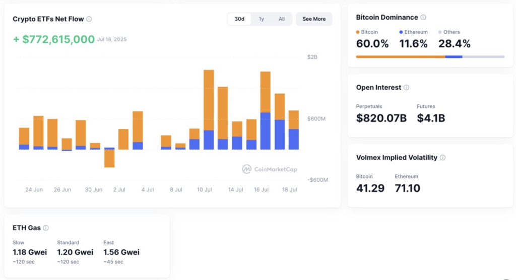 The top left part of the chart displays Crypto ETFs Net Flow, which is the net amount of funds that have entered or exited crypto ETF products over the past 30 days. On July 18, 2025, a positive inflow of +$772,615,000 was recorded, which is a strong signal that institutional interest in crypto is on the rise.