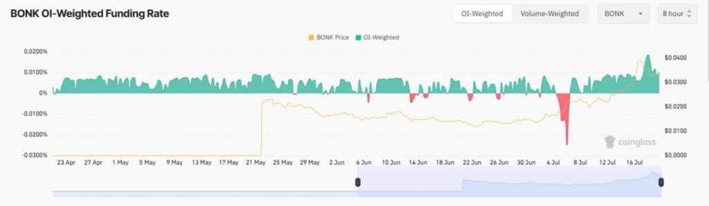The derivatives market is showing a very bullish sentiment towards Bonk (BONK). Currently, the Open Interest Weighted Funding Rate remains above the positive threshold. Analysis from AMBCrypto shows that Bonk (BONK) has broken out of a bullish chart pattern with an upside target of $0.00003900.