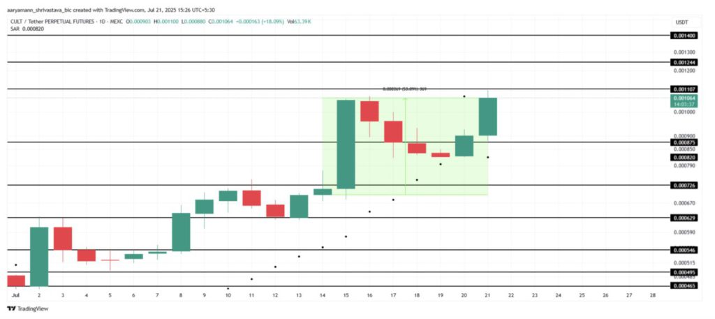 If that happens, CULT could potentially continue its rise towards $0.00124, reinforcing the bullish sentiment towards this asset.