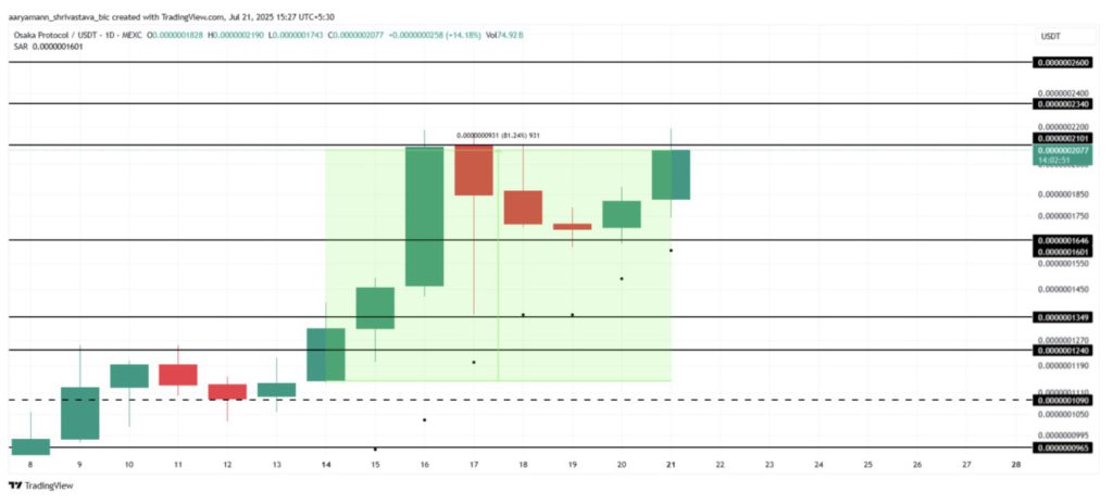 OSAK has emerged as one of the best performing meme coins this week, having surged 81% in the last seven days. Earlier this week, OSAK was trading at $0.0000002077 and managed to catch the attention of investors thanks to its strong momentum.
