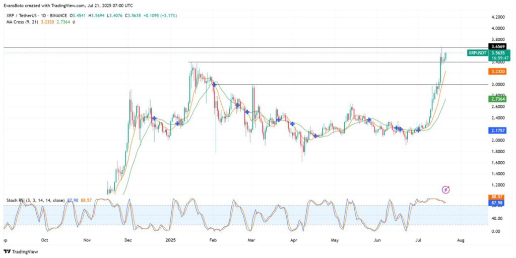 Ripple (XRP) is currently facing strong resistance near the $3.66 zone after a sharp rally. However, the Stochastic RSI is showing overbought signals, indicating that the bullish momentum may have started to fatigue. Also, the price consolidation below the resistance indicates market uncertainty.