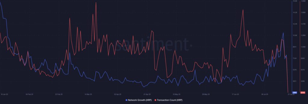 On-chain metrics for Ripple (XRP) show a significant decline, which calls into question the sustainability of the recent rally. The number of transactions has dropped to 221,000, while network growth has plummeted to just 1,864 new addresses. This decline in activity and onboarding of new users reduces confidence in long-term demand.