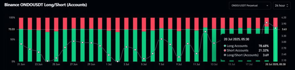 The latest data from CoinGlass shows that the Long/Short ratio for ONDOUSDT on Binance is 3.69, which signifies that there are far more traders going long than going short. This is a strong indicator that the current market sentiment is very bullish towards ONDO.