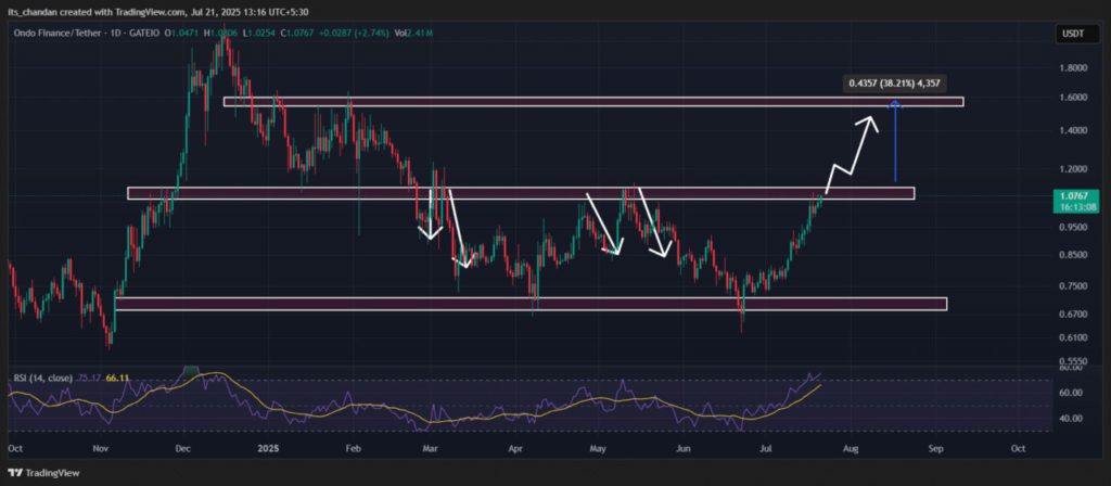 A widely followed crypto expert recently predicted that ONDO could see a price increase of between 40% to 50% if it manages to close above $1.20. Currently, ONDO is at $1.07 and has shown a 4% increase in the last 24 hours. If ONDO manages to break and close above $1.15, this could be a catalyst to reach the $1.60 price target.