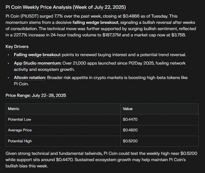 According to Perplexity’s predictions, Pi Coin is expected to trade in the range of $0.4470 to $0.5200 this week, with an average price of around $0.4820. The AI model shows that a breakout from the falling wedge pattern indicates a reversal of the previous bearish trend.