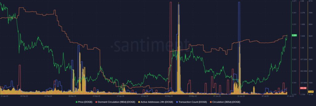Meanwhile, the number of transactions also showed an upward trend in July, but there were no signs of capitulation or bubbles bursting at local price peaks. Dogecoin’s annual circulation has increased since May, which could be an indication of increased adoption. Existing holders may be taking profits, but new market participants are also starting to enter. This begs the question, does the price action support the prediction that Dogecoin will continue to rally?