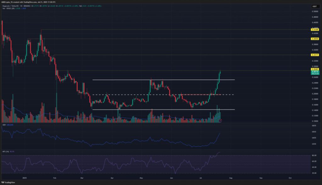 The range formation formed since March has extended from $0.142 to $0.25. On July 20, Dogecoin managed to break the key resistance at $0.25 with trading volumes well above the average for the past twelve days. Based on the width of the range, Dogecoin’s current rally is expected to reach at least $0.33.