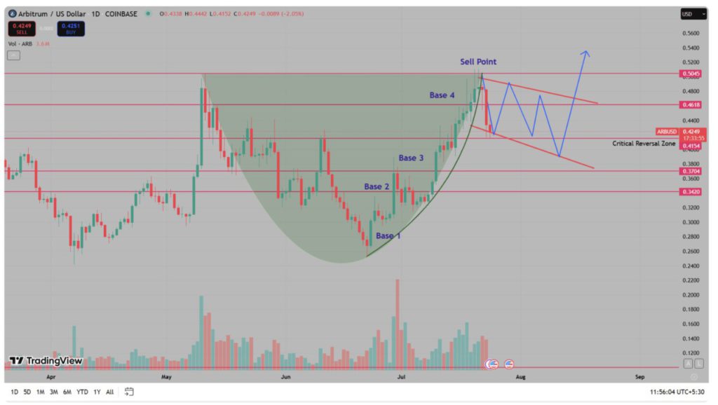 Harga ARB telah memantul dari level dasar di $0,34, melewati beberapa zona support, dan kini tengah berkonsolidasi di kisaran $0,461 hingga $0,5045, membentuk bagian “handle” dari pola tersebut.