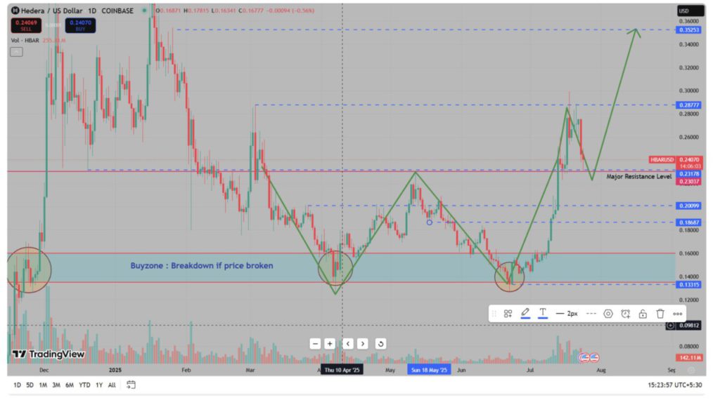 Hedera (HBAR) telah berhasil breakout dari pola W yang terbentuk selama beberapa bulan terakhir, dengan reli harga dari zona beli $0,13–$0,14 hingga mencapai level tertinggi lokal di $0,287 sebelum mengalami koreksi.
