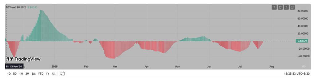 Indikator BBTrend baru saja berubah menjadi positif (hijau) setelah cukup lama berada dalam kondisi negatif, memperkuat kemungkinan reli lanjutan menuju $0,35 atau lebih.