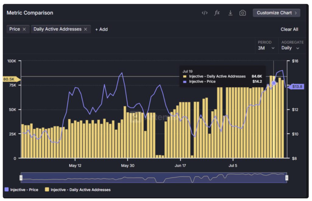 Harga Injective (INJ) mencerminkan lonjakan signifikan dalam aktivitas jaringan, dengan jumlah alamat aktif harian melonjak 1.770%—dari hanya sekitar 4.500 pengguna di awal 2025 menjadi puncak 84.600 pengguna pada 19 Juli. Ini merupakan tingkat aktivitas pengguna tertinggi sepanjang sejarah Injective.