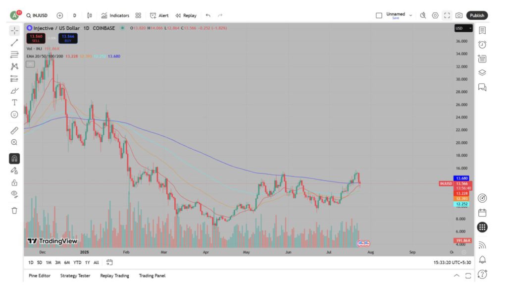 Harga INJ saat ini juga tengah menguji rata-rata pergerakan 200 hari (200-day EMA) di kisaran $13,6, yang menjadi level support penting.