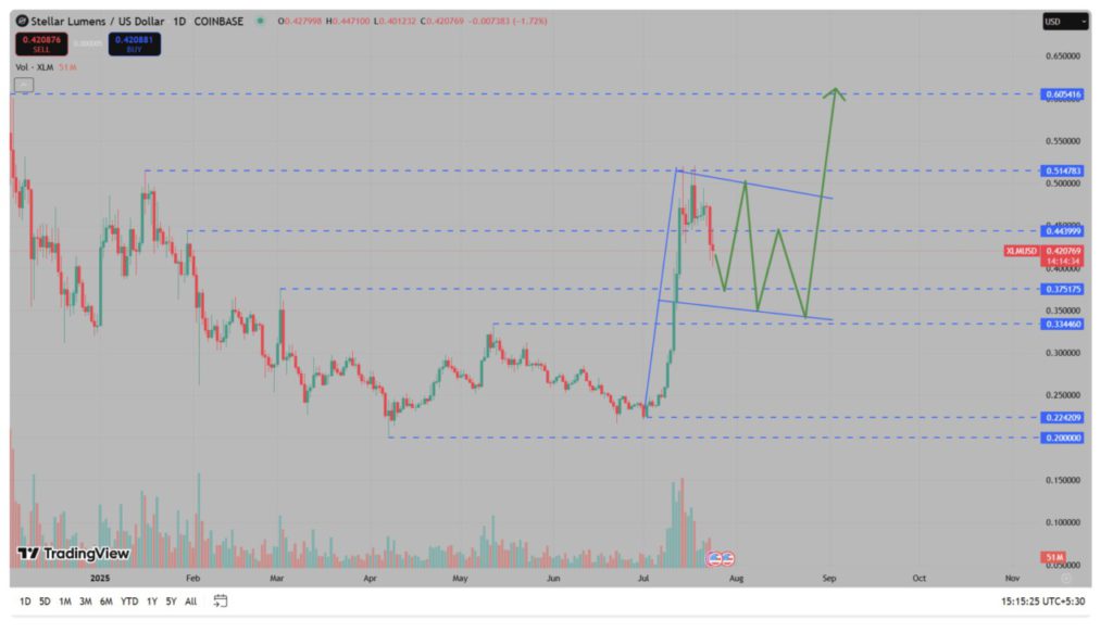 Saat ini, harga XLM tengah berkonsolidasi dalam pola Bullish Flag di kisaran $0,33 hingga $0,44, setelah berhasil breakout dari tren turun jangka panjang.