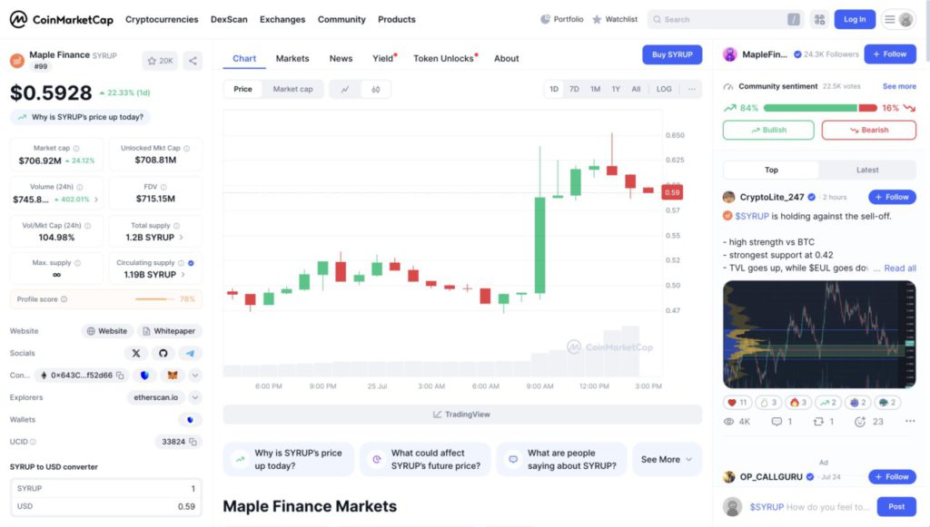 The chart above shows the price movement of Maple Finance (SYRUP) in the last 24 hours, which experienced a sharp spike. SYRUP price increased by 22.33%, reaching $0.5928 or around Rp9,629 (at an exchange rate of $1 = Rp16,245).