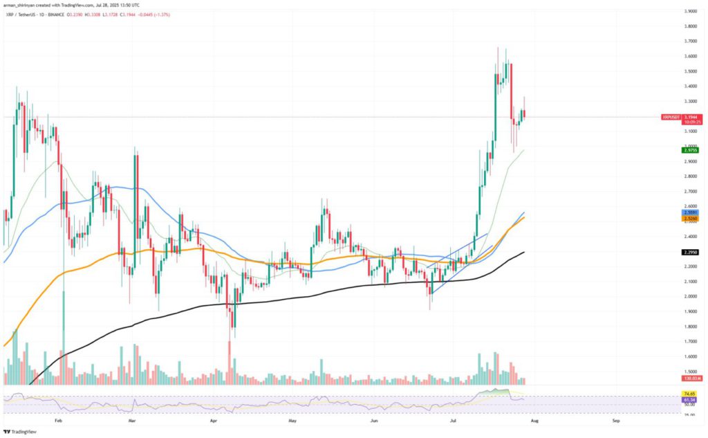 If the price of Ripple (XRP) returns to the $3.50 area and fails to sustain gains, it could print the second peak of the double top. This could indicate a price reversal in the short or medium term. The Relative Strength Index (RSI) being close to 75 also adds to the concerns of potential market exhaustion.