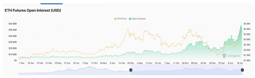 Ethereum (ETH) futures on the Chicago Mercantile Exchange (CME) have reached a record high with open interest of $7.85 billion. This rapid growth in open interest signals strong speculative activity in the crypto market and enlarged institutional involvement.