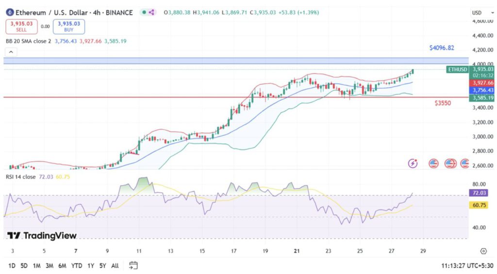 Currently, Ethereum (ETH) price is at $3,933.77 after briefly touching a daily high of $3,934.75. The RSI indicator shows overbought levels at 72.03, while the price continues to follow the upper Bollinger Band.