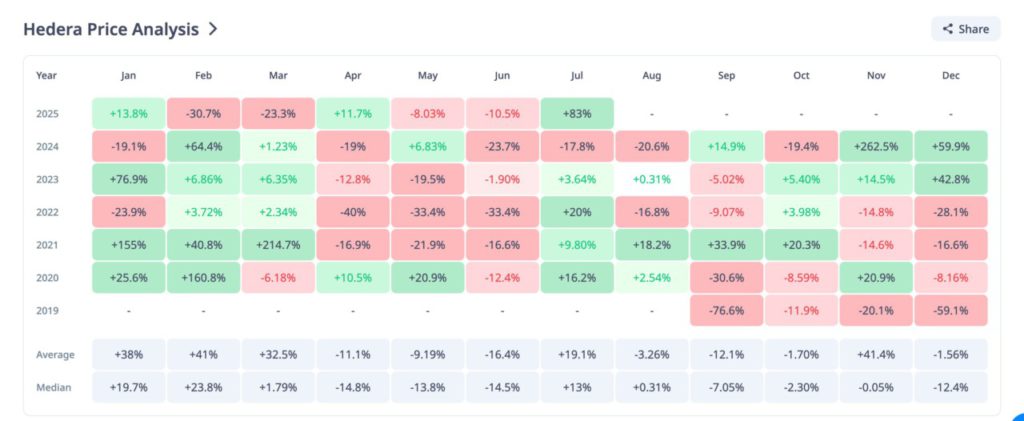 Jakarta, Pintu News – Hedera just closed the month of July with an astounding gain of 85%, recording its strongest monthly performance this year. However, August is often not in HBAR’s favor. In the last five years, HBAR’s average return in August is minus 3.26%, with a median of just 0.31%. This makes August one of the least favorable months for this asset.