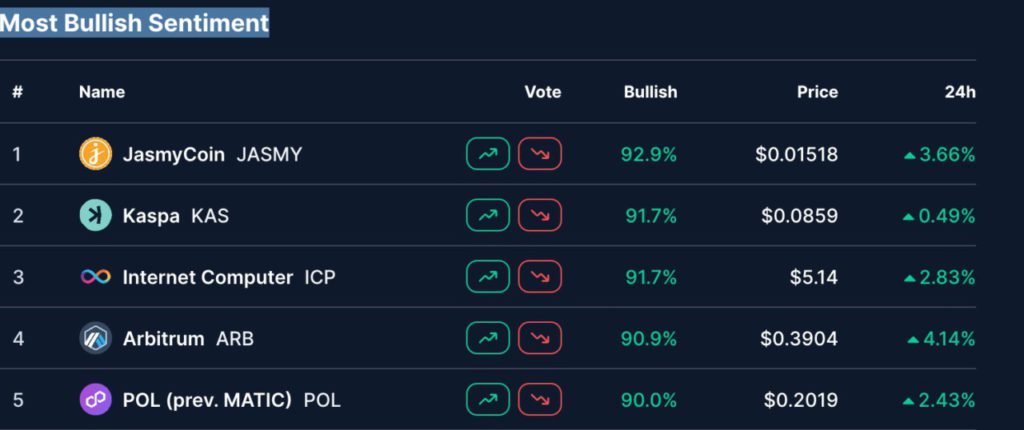 Polygon, now transformed into POL, remains in the top five of the community’s bullish sentiment. As a Layer 2 pioneer with an extensive DeFi and NFT ecosystem, many users believe POL will continue to grow as the Ethereum network evolves.