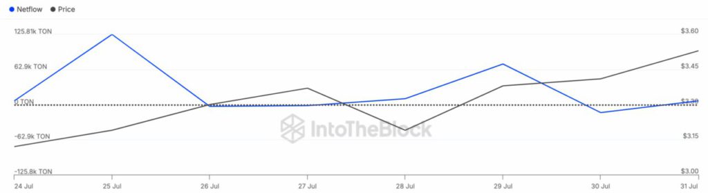 IntoTheBlock data confirms a positive net flow from large holders, meaning that more TON is being bought than sold. If the accumulation trend continues and selling pressure remains low, TON has the potential to rise above US$4 (IDR65,528) and even higher in August 2025.