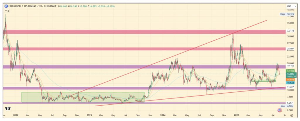 Chainlink (LINK) is currently at $16.04, with indicators showing increasing pressure on the short-term support zone. Increased sales in late July have pushed the price down, especially after reaching $20.