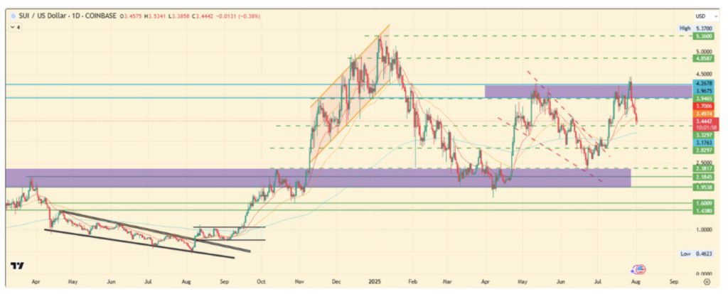 Sui (SUI) has shown strong growth in July with the breakout of the falling wedge pattern and reached its peak at $4.30. However, at the end of July, there was profit-taking which continued in early August, bringing the price down to the $3.32 support zone.