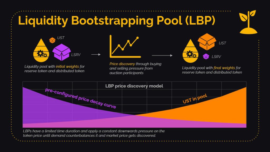 LBP is designed to make it easy to launch tokens with lower capital requirements. A two-token pool was created with project tokens and collateral tokens. Initially, the weighting is set in favor of the project tokens. Over time, a gradual change occurs where the collateral tokens become more dominant at the end of the token sale. Controllers can manage the sale to maintain price stability to maximize revenue or lower the price to a desired minimum.