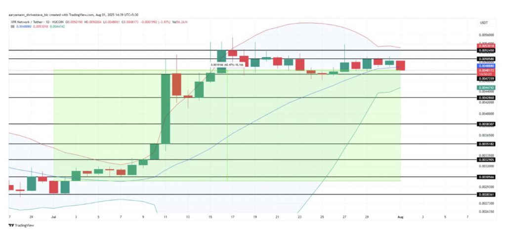 XPR Network (XPR) has recorded a 60% gain this month, with the current price standing at $0.00481. Despite the significant gains, XPR is still consolidating below the $0.00505 resistance level for the past two weeks.