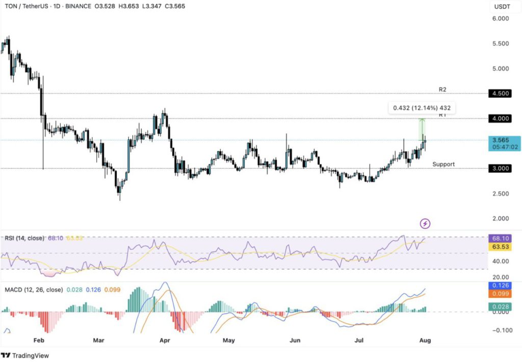 Technical indicators support further upside potential. RSI is at 68 with an upward trend, while MACD shows bullish momentum. However, if a correction occurs, TON could test the support area at $3 or around Rp49,173 before resuming the uptrend.