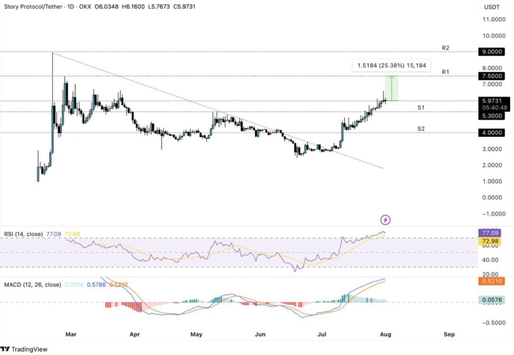 Story (IP) was trading at $5.97 or IDR97,923, close to the psychological level of $6. In the last seven days, IP recorded a 15% rally despite a 2.44% correction on Friday. Key resistance levels are at $7.5 and $9, while key supports are at $5.3 and $4.