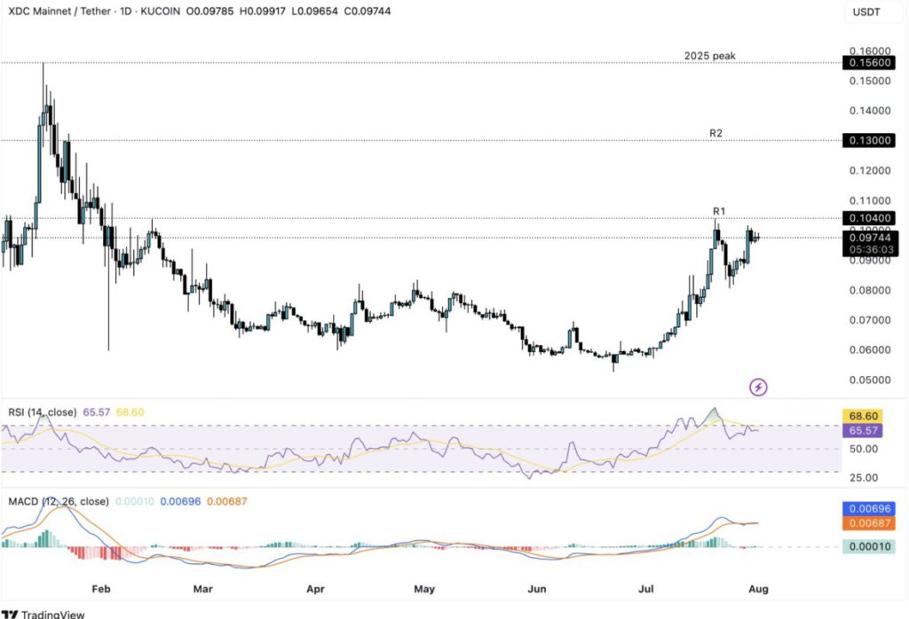 XDC Network (XDC) is now at $0.09744 or Rp1,598, approaching first resistance at $0.104 and second target at $0.13. In the last seven days, XDC gained 16% and is now on track to possibly test the 2025 peak at $0.156.