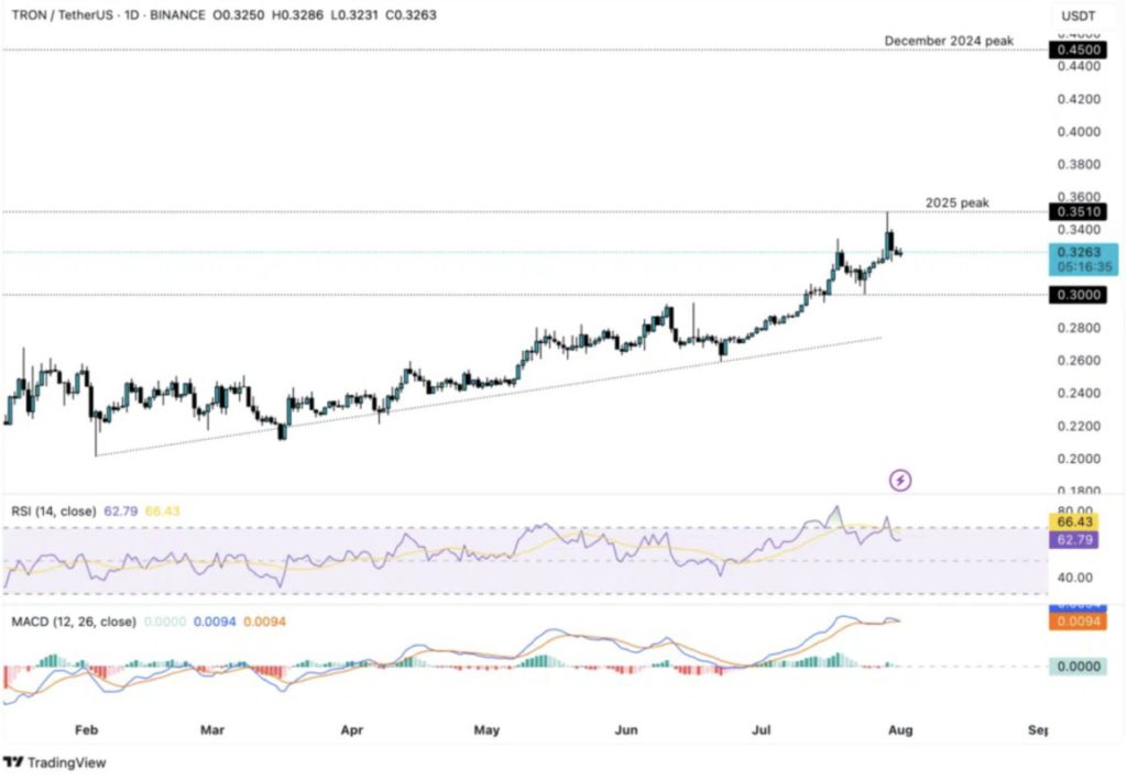 TRON (TRX) remains on an uptrend through 2025 and is now trading near its yearly peak at $0.3510 or €5,754. The 2024 peak is at $0.45, so there is still room for upside if the positive momentum holds.