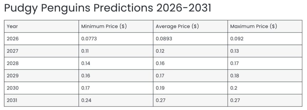 Here’s a summary of Pudgy Penguins price predictions for the next few years: