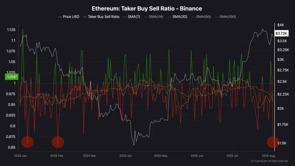According to leading analyst Darkfost, Ethereum’s (ETH) buy/sell taker ratio today plummeted into negative territory, reaching 0.87-one of the lowest levels recorded since the beginning of the year. This metric, which measures the ratio of aggressive buyers to sellers in the futures market, suggests that selling pressure is currently controlling the Ethereum (ETH) order book.