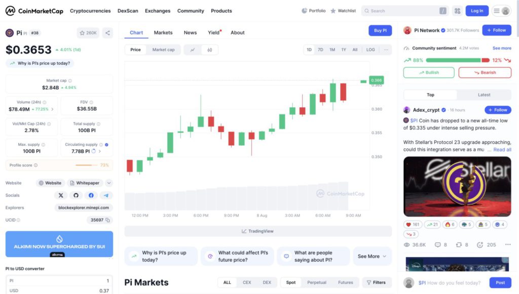 Based on the price chart in the screenshot, the movement of Pi Network (PI) in the last 24 hours shows a fairly consistent upward trend. The current PI price is in the range of $0.3653, up about 4.01% in a day. The market capitalization was recorded at $2.84 billion, an increase of 4.94%, while the 24-hour trading volume jumped 77.25% to $78.49 million.