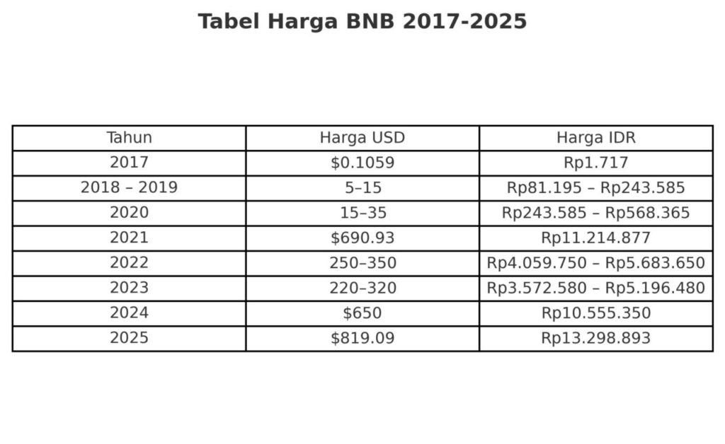 From a starting price of IDR1,717 in 2017 to over IDR13 million in 2025, BNB’s journey reflects the rapid growth of Binance and its ecosystem. With its dual role as a utility token and investment asset, BNB has managed to maintain its position at the top of the global market capitalization. However, the volatility of the crypto market remains an important factor for investors to take into account.
