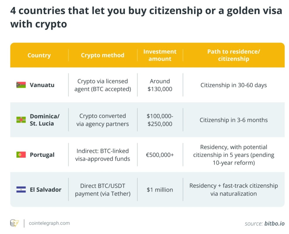 According to Cointelegraph, a number of countries are now offering citizenship pathways or golden visas for investors who use digital assets, including Bitcoin , Ethereum , and stablecoins like Tether .