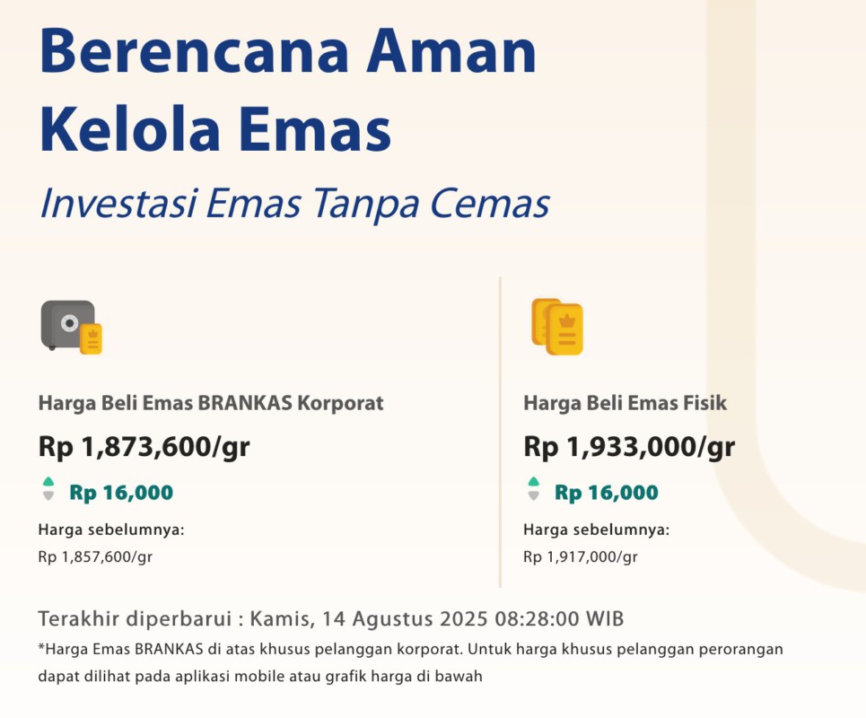 Jakarta, Pintu News – On Thursday, August 14, 2025 at 08:28 WIB, the BRANKAS Corporate gold buying price was recorded at IDR 1,873,600 per gram. This price increased by Rp 16,000 from the previous day which was at Rp 1,857,600 per gram. A similar increase also occurred in the price of physical gold which now touches IDR 1,933,000 per gram from IDR 1,917,000.