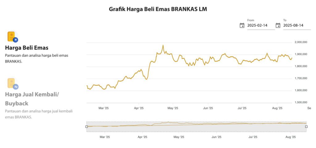 If you look at the graph from February 14 to August 14, 2025, the trend of BRANKAS gold purchase prices shows a fluctuating pattern but with an upward trend. The highest point was reached in mid-May 2025, where the price almost touched IDR 2,000,000 per gram. Thereafter, the price moved down but remained above IDR 1,800,000, showing medium-term stability.