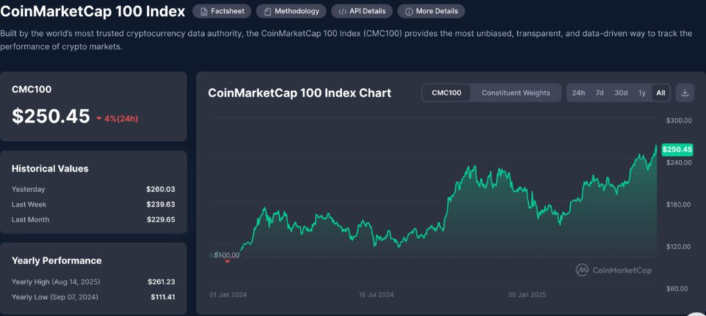 Jakarta, Pintu News – The CoinMarketCap 100 (CMC100) index, which tracks the combined performance of the 100 largest crypto assets by market capitalization, recorded a 4% drop in the last 24 hours to $250.45 or around Rp4.04 million (conversion of 1 USD = Rp16,153). This decline erased some of the gains made in recent days.