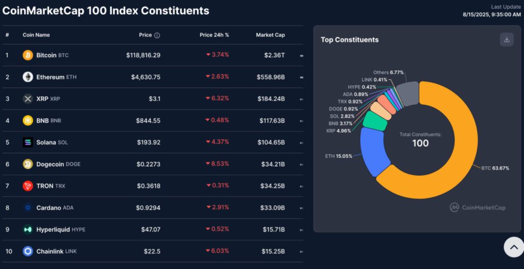 The data shows that Bitcoin accounts for 63.67% of the CMC100 index weight, followed by Ethereum (ETH) with 15.05%. Ripple (XRP) is in third place with 4.96%, while Binance Coin (BNB) and Solana (SOL) have weights of 3.17% and 2.82% respectively.