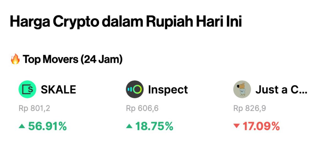 Jakarta, Pintu News – The crypto market in Rupiah on Friday, August 15, 2025, featured contrasting price movements. SKALE led the daily gains with a 56.91% surge to Rp801.2, followed by Inspect which rose 18.75% to Rp606.6.