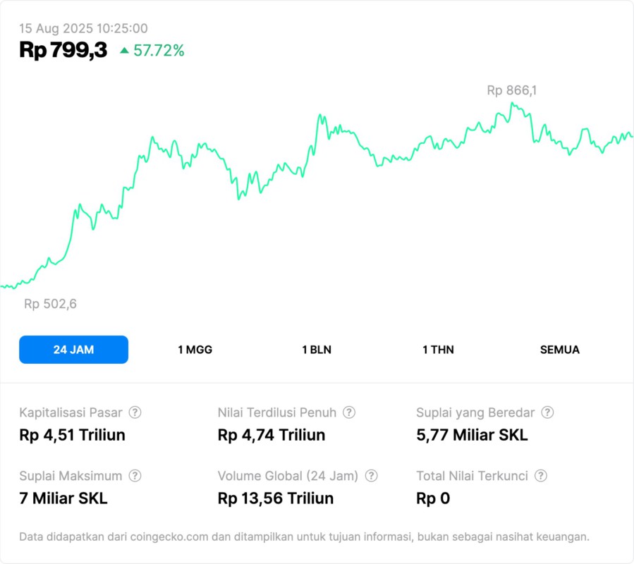 SKL’s sharp rise coincided with a surge in daily trading volume that exceeded market capitalization, indicating high trader interest. The daily high was recorded at IDR866.1, well above the opening around IDR502.6.