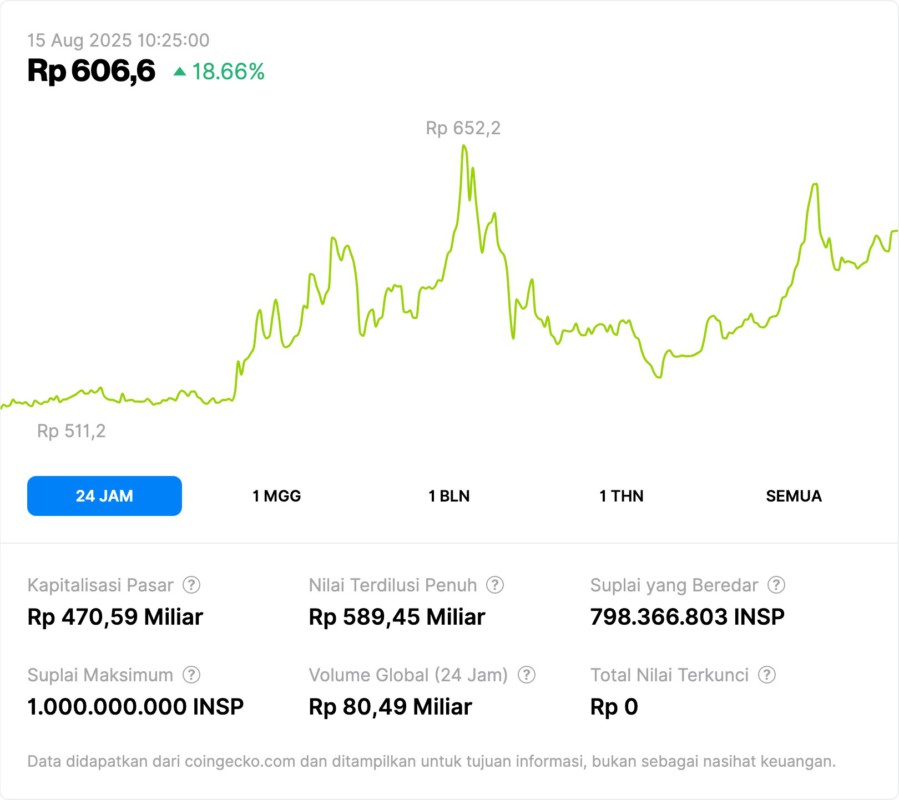 INSP’s rise continued the positive trend of the past few days, driven by community sentiment and potential altcoin rotation effects. The price briefly touched a peak of IDR652.2 before a mild correction.